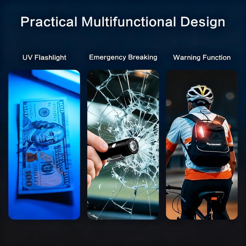 This EDC flashlight isn’t just a light source – it’s a 5-in-1 emergency & daily tool. Boasting a high-intensity main light (reaching 100 meters) and 9 versatile lighting modes (including UV for counterfeit detection, red/blue strobe for signaling), it keeps you visible and prepared. It also doubles as an emergency window breaker (tungsten steel tip) and features a built-in fire starter – covering every base for safety and utility.