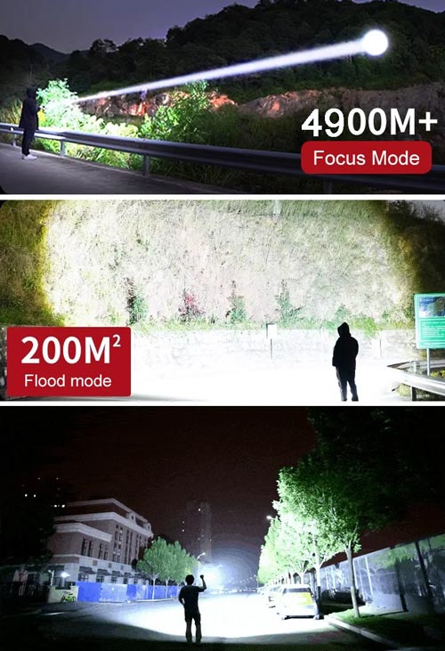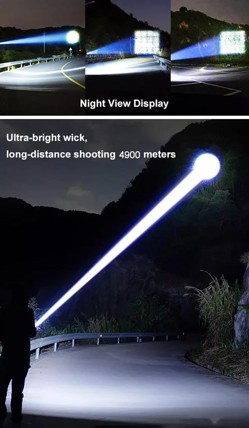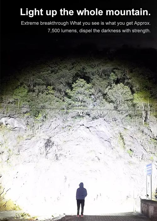 This compact and portable high lumen flashlight produces an incredible 7,500 lumens of brightness. It can cast its powerful beam up to 4900 meters away. Perfect for camping, hiking, cycling, fishing, or simply exploring after dark. This torch light ensures you never lose your way when night falls.